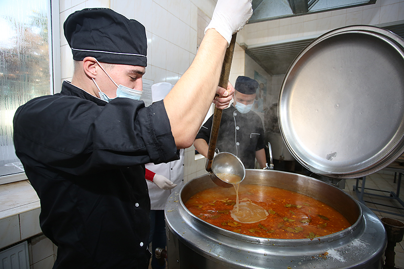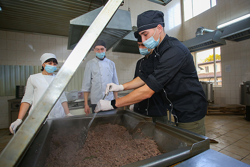 На початку заняття фахівці тилового забезпечення ознайомилися із роботою виробничих цехів, взяли участь в обробці продуктів харчування. Після цього, гвардійці приготували дві перші страви на вибір – суп-харчо і борщ, салат із баклажанів та картопляну запіканку з м’ясом. Кухарі їдальні Академії надавали допомогу майбутнім начальникам продовольчих служб.