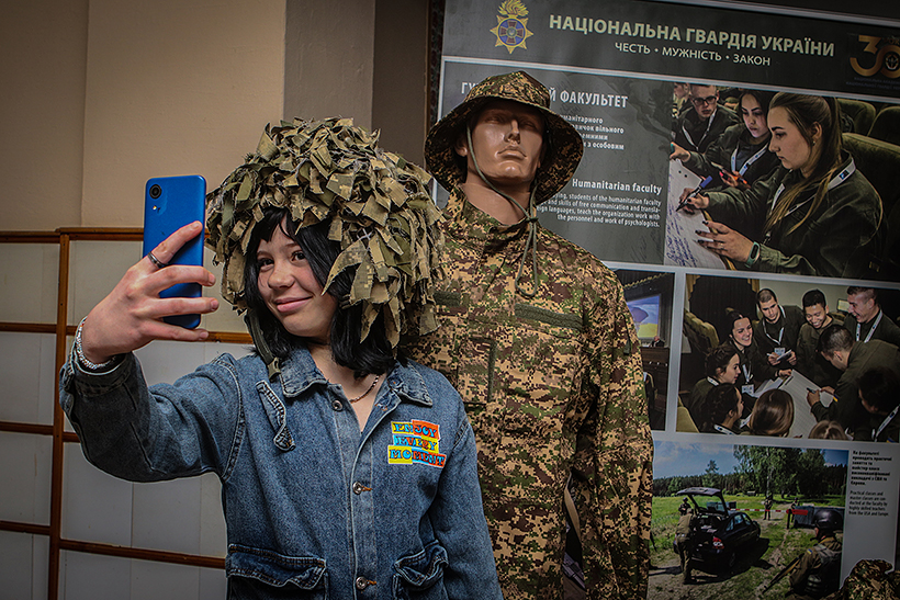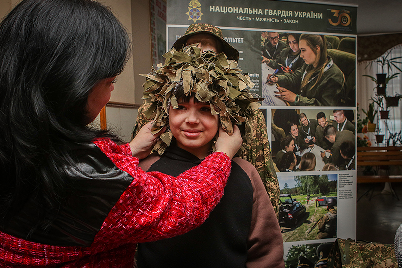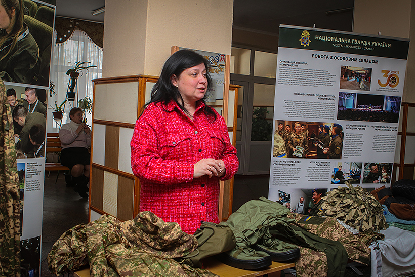 Директор музею Академії Марина Олександрова під час заходу представила зразки форми одягу гвардійців, які використовуються у Національній гвардії України. Вона детально пояснила функціональні особливості кожного елементу, від бронежилетів до спеціальних шоломів та іншого обладнання, яке забезпечує безпеку гвардійців на передовій.
