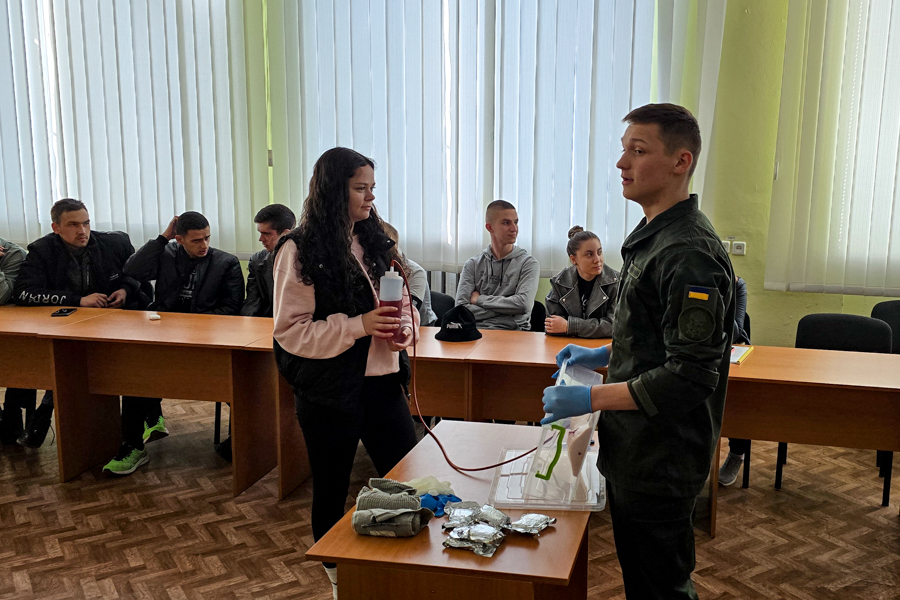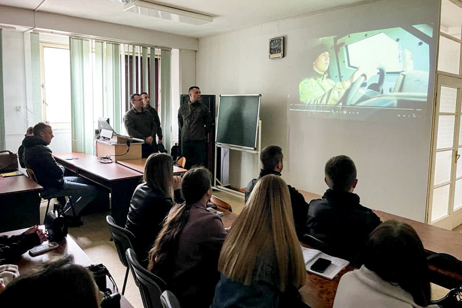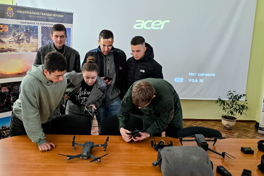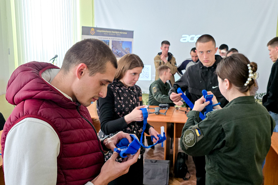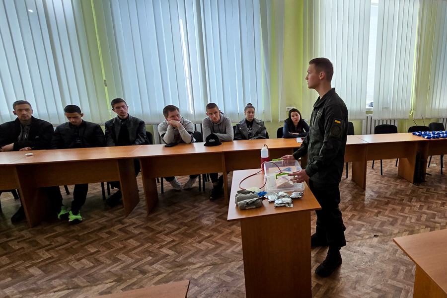 Курсанти діляться особистим досвідом навчання в Академії, показують екіпірування, спорядження, різноманітні засоби зв’язку, демонструють роботу БпЛА. Також проводять заняття з долікарської підготовки з детальним оглядом військової аптечки, накладанням турнікетів та тампонування ран.