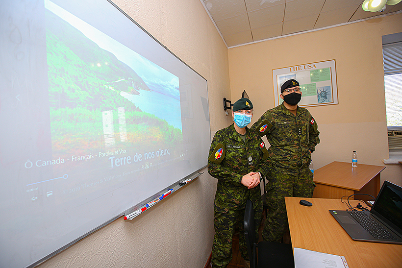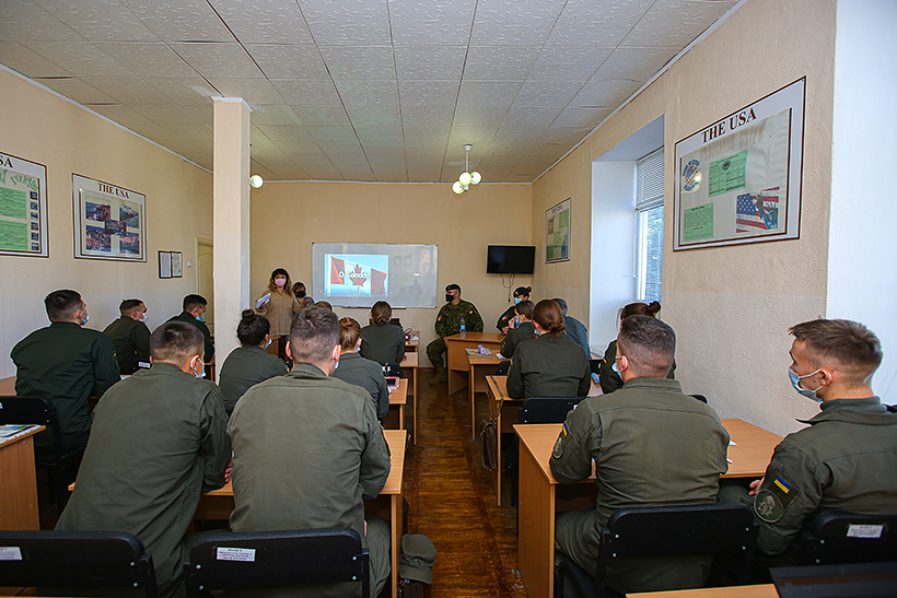 Курсанти разом із іноземними представниками говорили про Канаду. Після знайомства з канадськими військовими, учасники обговорювали такі теми, як географічне положення країни, дізналися більше про культурні особливості Канади, а також розкрили питання стереотипів, які склалися стосовно цієї країни та її громадян, зокрема військовослужбовців.
