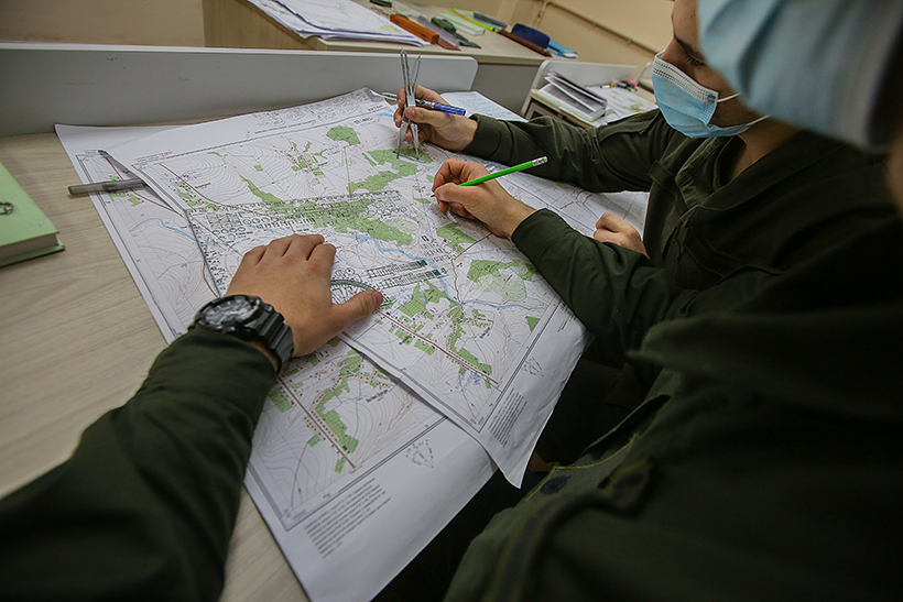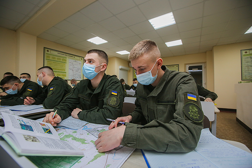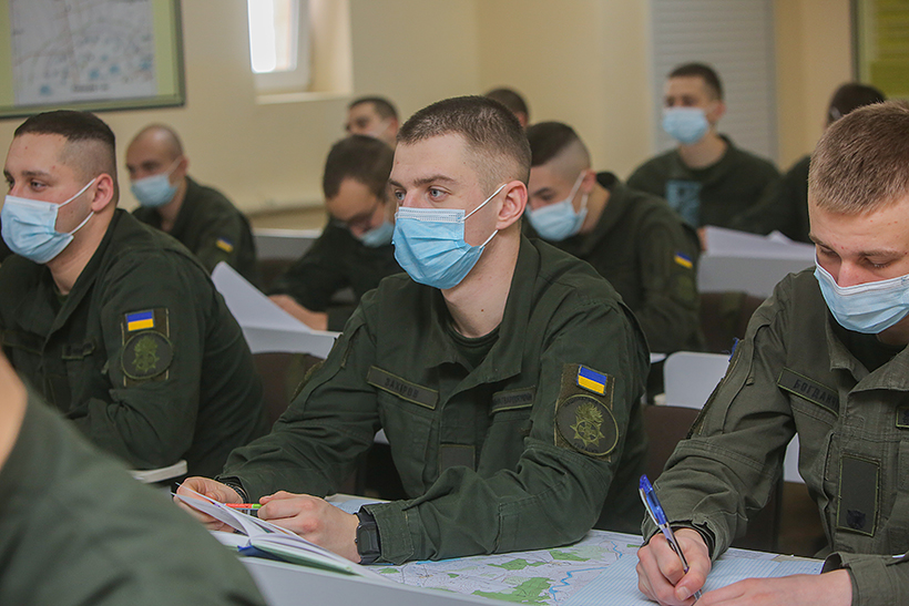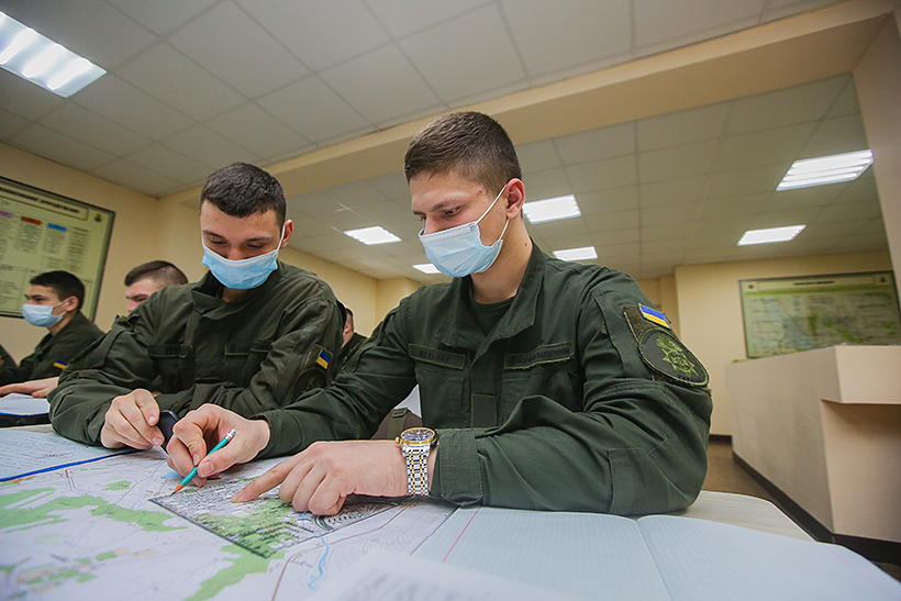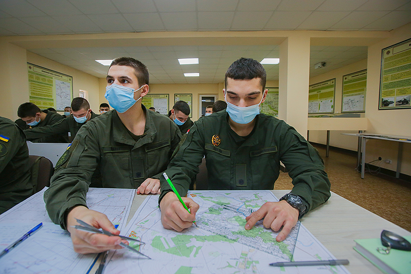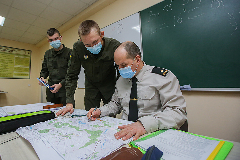Гвардійці першого року навчання командно-штабного факультету Національної академії Національної гвардії України вчилися орієнтуватися на топографічних картах, використовуючи системи координат, що застосовуються у військах.