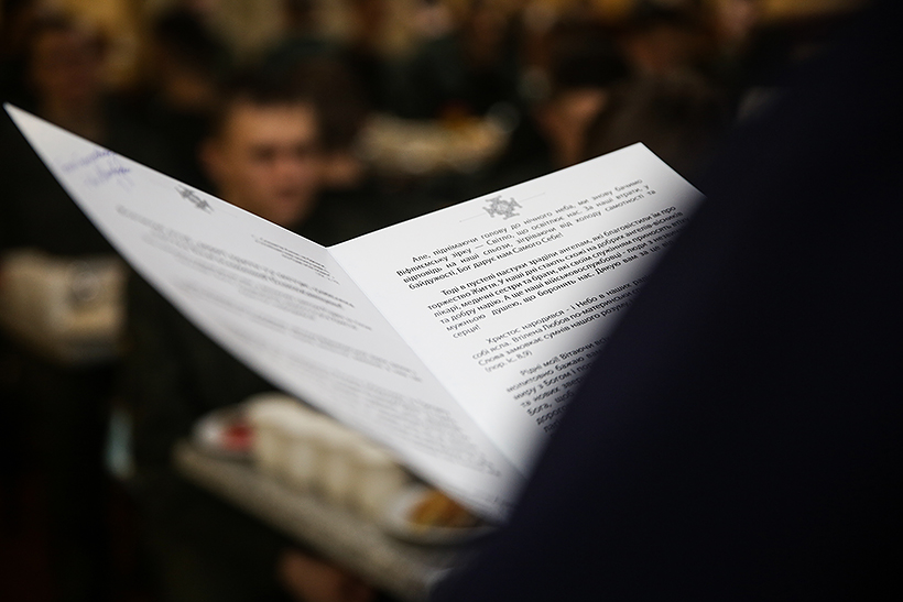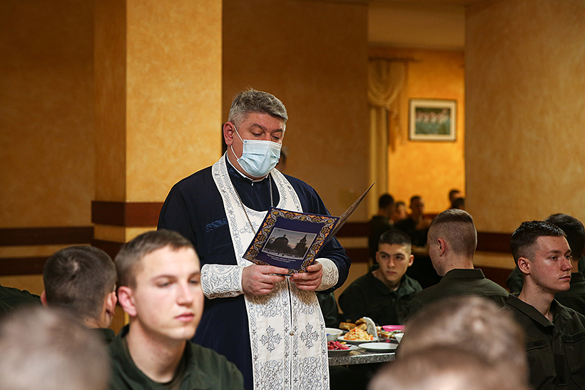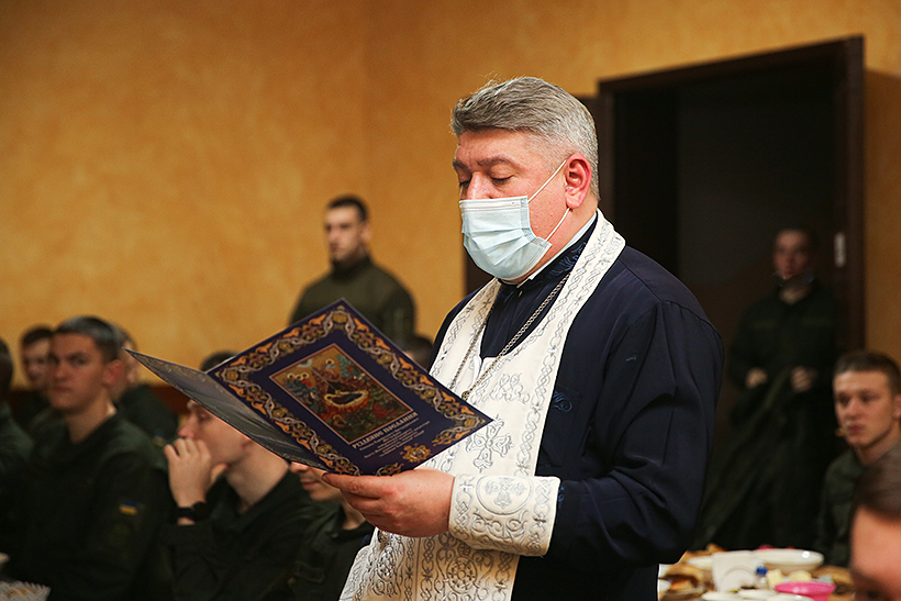 На святкову вечерю прийшов військовий капелан Академії отець Григорій. Він благословив військовослужбовців з нагоди свята невеличкою проповіддю та освятив вечерю.