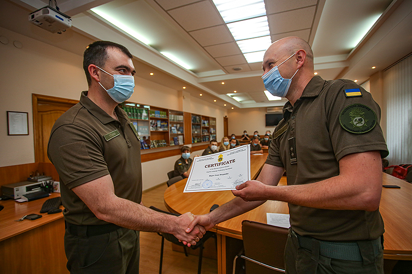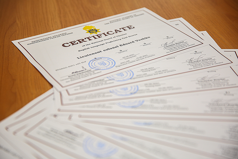 По завершенню інтенсивних курсів, учасники пройшли тестування до якого входила перевірка знань із аудіювання, читання, спілкування та письма. Наприкінці зборів, заступник начальника навчально-методичного центру – начальник навчального відділу полковник Андрій Горбунов вручив офіцерам сертифікати в яких зазначений рівень знань кожного з учасників. До числа кращих увійшли 7 військовослужбовців Національної гвардії України.