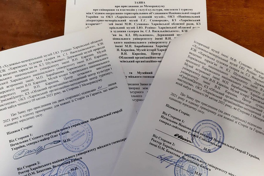 Нагадаємо, у травні поточного року у Харкові – вперше в Україні - було підписано Меморандум про співпрацю у галузі культури між Національною академією Національної гвардії України, Східним оперативно-територіальним об’єднанням НГУ та ОКЗ «Харківський художній музей», ОКЗ «Національний літературно-меморіальний музей Г.С. Сковороди», КЗ «Харківський історичний музей імені М.Ф. Сумцова» Харківської обласної ради, КЗ «Художньо-меморіальний музей І.Ю. Рєпіна» Харківської обласної ради, КЗК «Харківська художня галерея ім. С.І. Васильківського», КЗК «Музей видатних харків’ян ім. К.І. Шульженко», КЗ «Обласний організаційно-методичний центр культури і мистецтва», ОКЗ «Харківський організаційно-методичний центр туризму», Державним музеєм природи ХНУ ім. В.Н. Каразіна, Музеєм археології ХНУ ім. В.Н. Каразіна, Музеєм астрономії ім. М.П. Барабашова ХНУ ім. В.Н. Каразіна та Центр сучасного мистецтва «ЄрміловЦентр». Підписання Меморандуму дозволило налагодити якісний та творчий відпочинок строковиків та курсантів – щомісяця понад 1000 гвардійців відтепер мають можливість знайомитись з кращими творами українського та світового мистецтва, історичними експонатами, на які багаті музеї та галереї Харківщини.