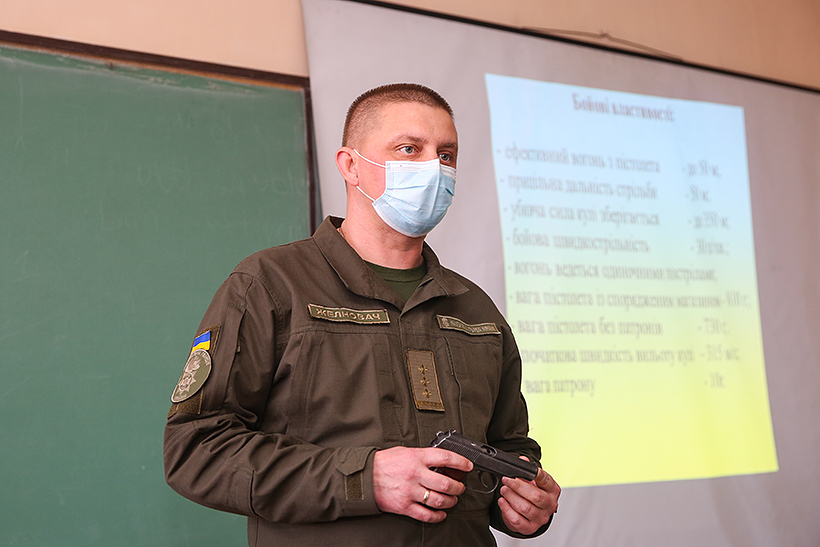 Полковник Олександр Желновач провів пробне заняття щодо призначення, бойових властивостей та загальної будови 9-мм пістолета Макарова. Під час заняття він використовував навчальну зброю, макети частин, механізмів та сучасне матеріально-технічне забезпечення.