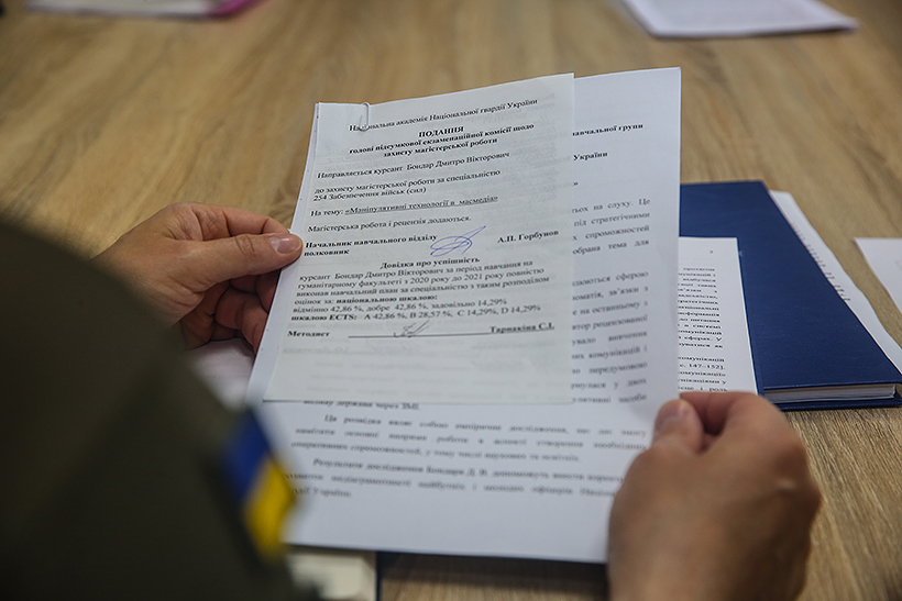 «Тематика магістерських робіт мене приємно вразила. Всі теми магістерських робіт були актуальними і важливими для розвитку Національної гвардії України. Це те, що стосується розвитку стратегічних комунікацій, проблематики перекладу і термінології НАТО, а також вплив чорного піару і маніпуляцій в мас-медіа, – зазначив начальник управління міжнародного співробітництва департаменту персонального штабу Головного управління НГУ полковник Володимир Грабчак. – Загалом, я відмітив для себе, що з кожним роком військовослужбовці більш завзято підходять до тематики магістерських робіт. Видно, що курсанти добре підготовлені, і це відчувається в підготовці і викладені матеріалу під час захисту робіт. Також приємно відмітити, що деякі курсанти захищалися англійською мовою. Вони впевнено володіли мовою і понятійним апаратом».