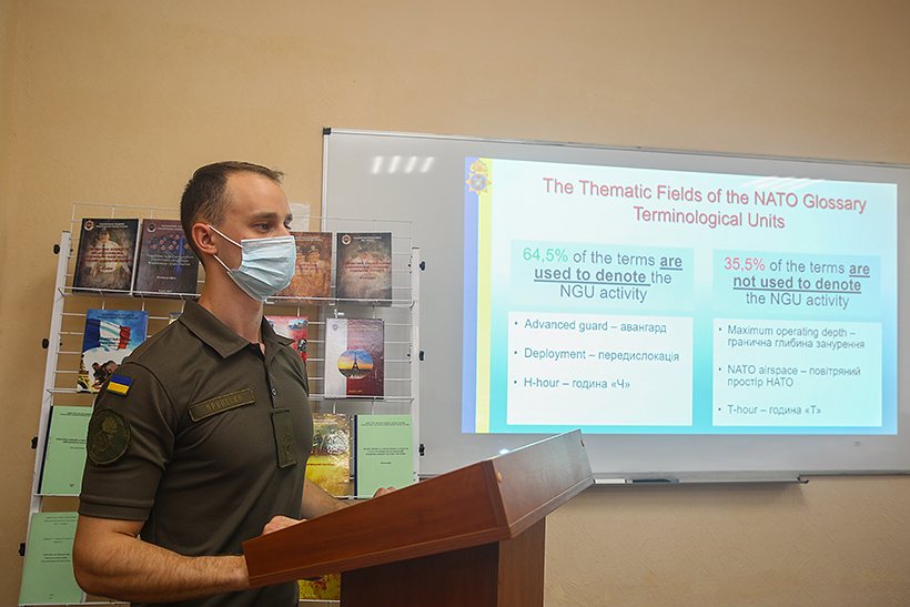 «На написання магістерської роботи я витратив майже рік. Я розумів, що це об’ємна робота, яку необхідно досліджувати ґрунтовно. Крім того, я вирішив захиститися англійською мовою, адже отримав за роки навчання достатній рівень знань для вільного спілкування. Досліджував особливості перекладу термінології НАТО і матеріалом для дослідження був глосарій спеціальних термінів НАТО у сфері безпеки та оборони. Був досліджений структурно-композиційний аналіз термінів НАТО, з’ясована тематична належність, тобто порівняв терміни, які використовуються в країнах НАТО і у нас», - розповідає курсант гуманітарного факультету старший солдат Євгеній Проценко.