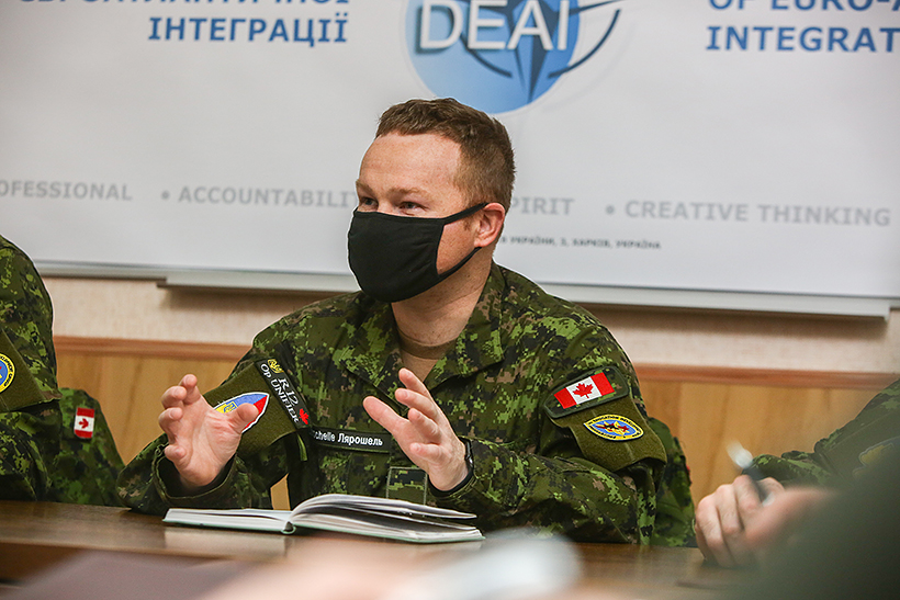 Вчора відбулася зустріч представників командно-штабного факультету, факультету логістики Академії та відділу євроатлантичної інтеграції з командиром групи розвитку професійної військової освіти ЗС Канади в Україні майором П’єр-Люком Ларошель та військовослужбовцями 12–ої ротації Об’єднаної оперативно-тактичної групи Збройних сил Канади (операції UNIFIER).